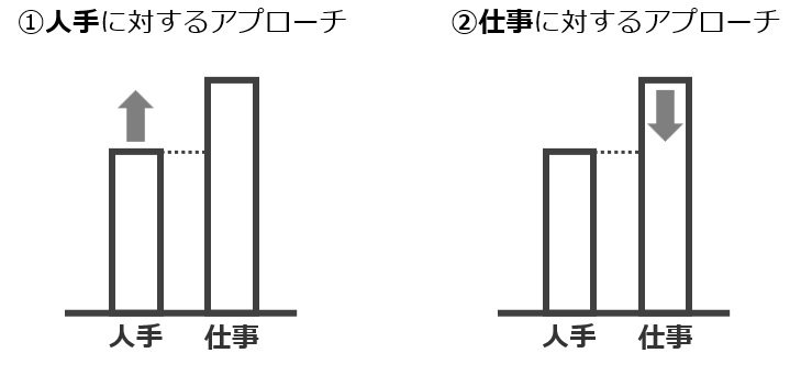 人手不足とは「やるべき仕事」に対して「人手」が足りていない状況です。解決に向けては、大きく分けて2つのアプローチがあります。